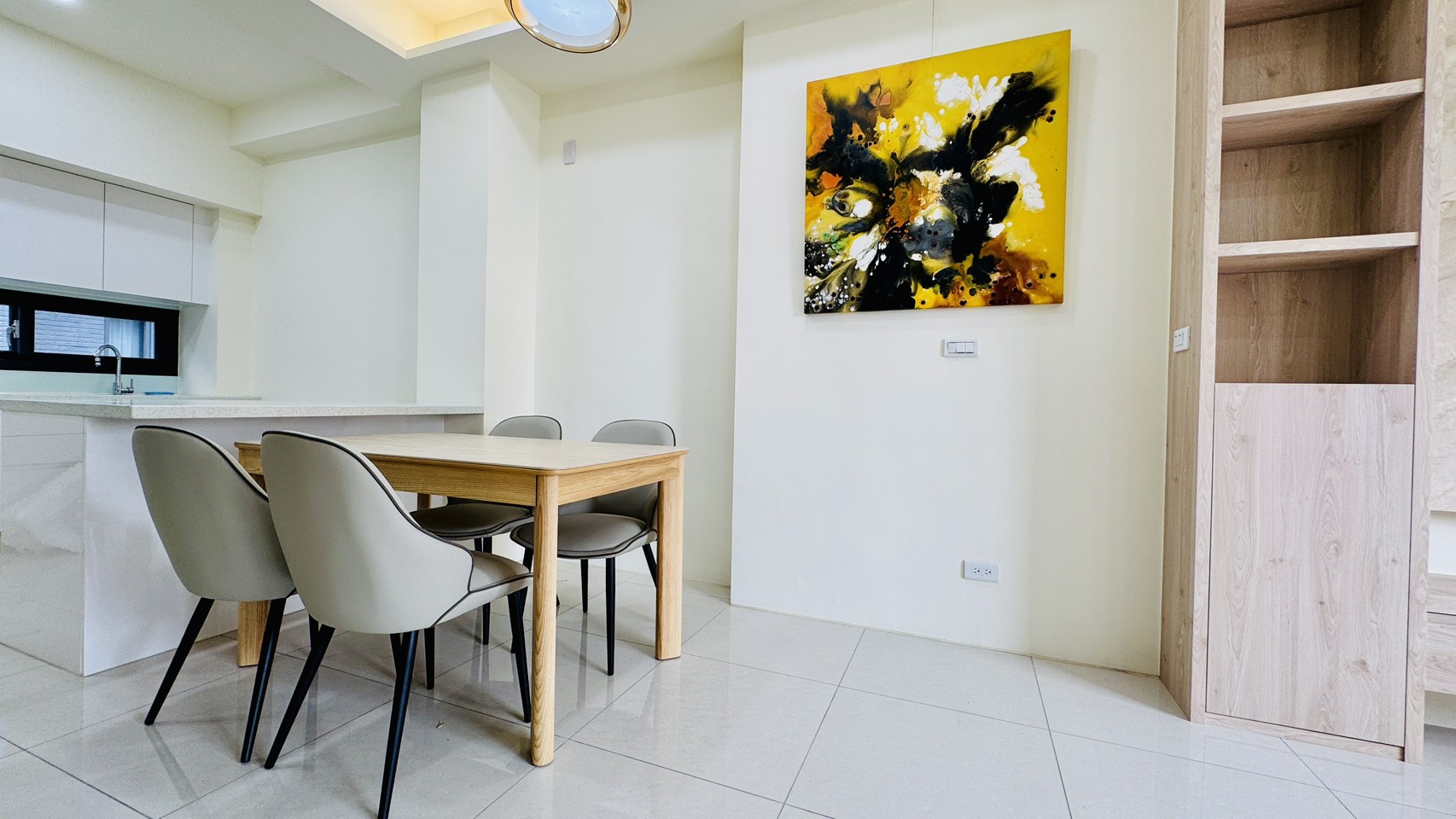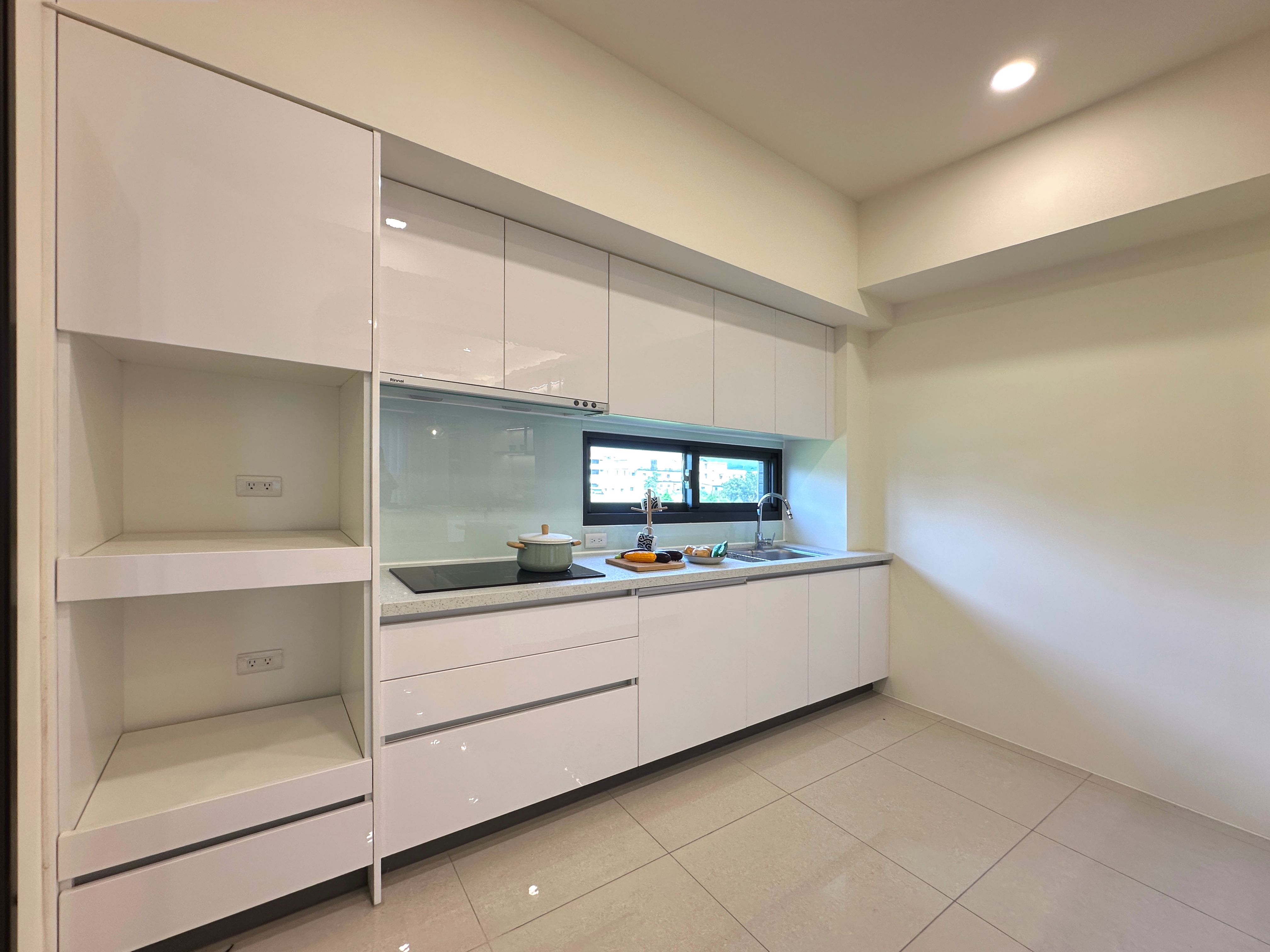 🌱 L型廚具搭配電器櫃中島,採用高級歐化設計檯面、林內IH雙口爐、強化玻璃排油煙機