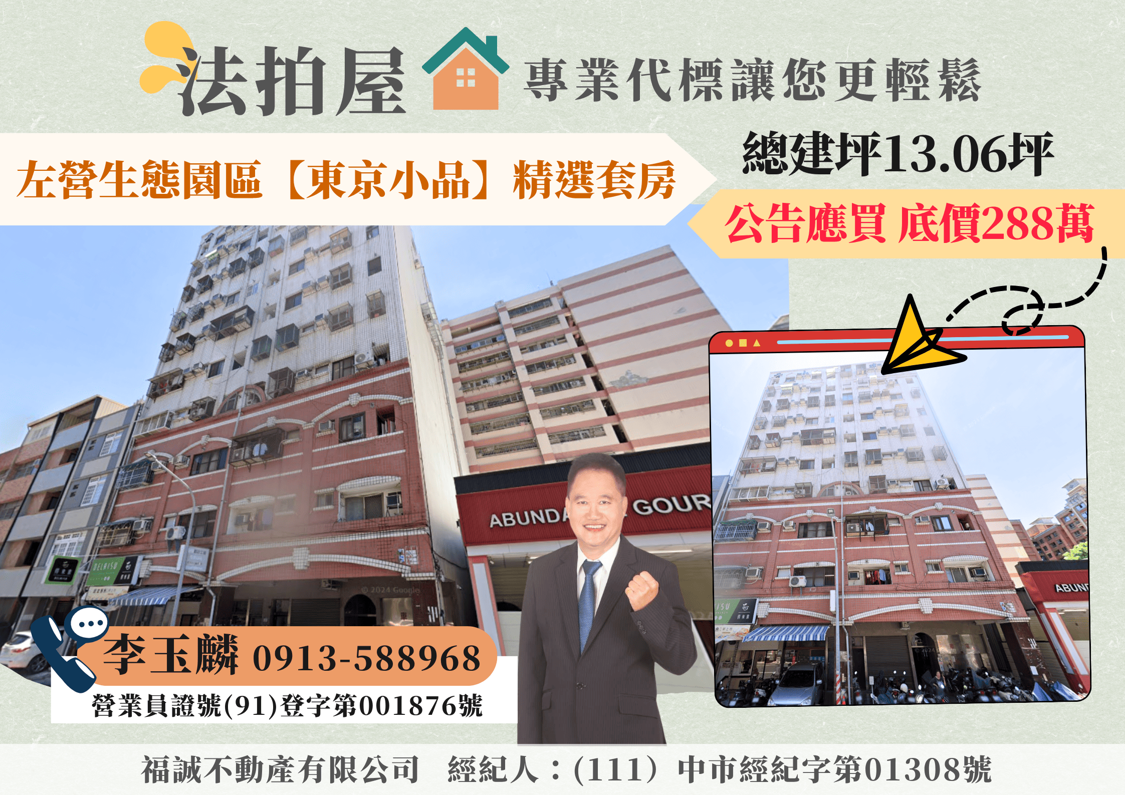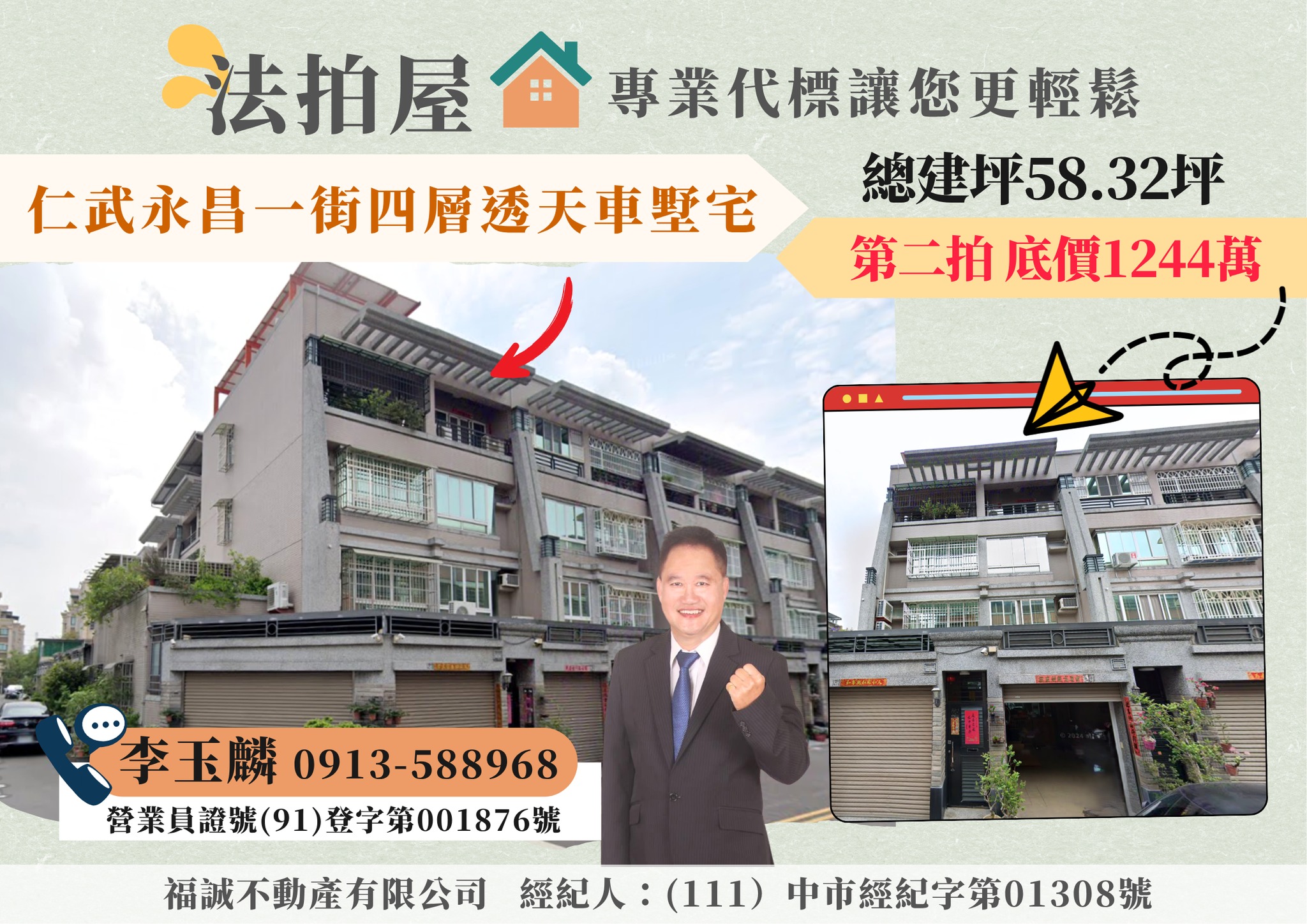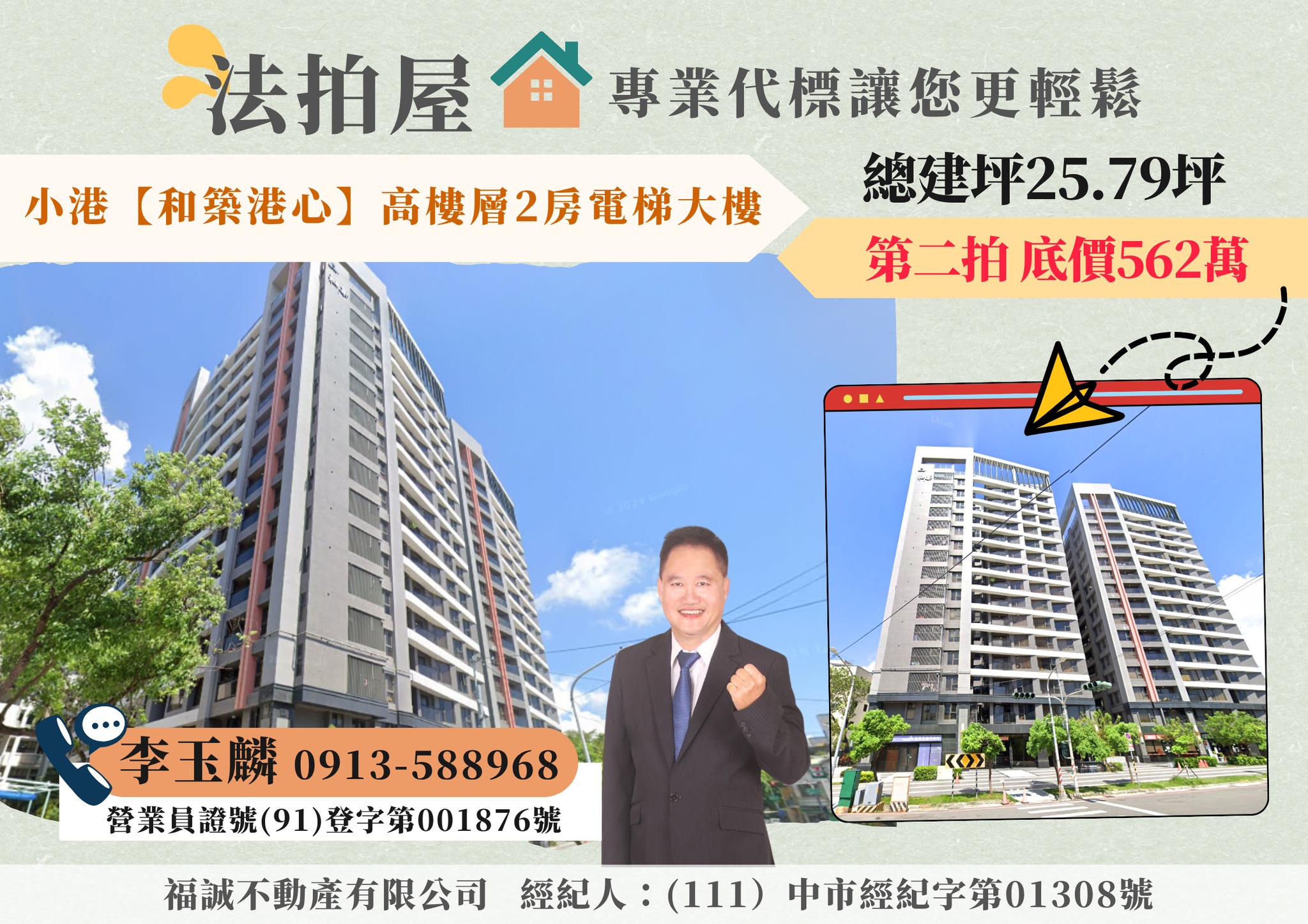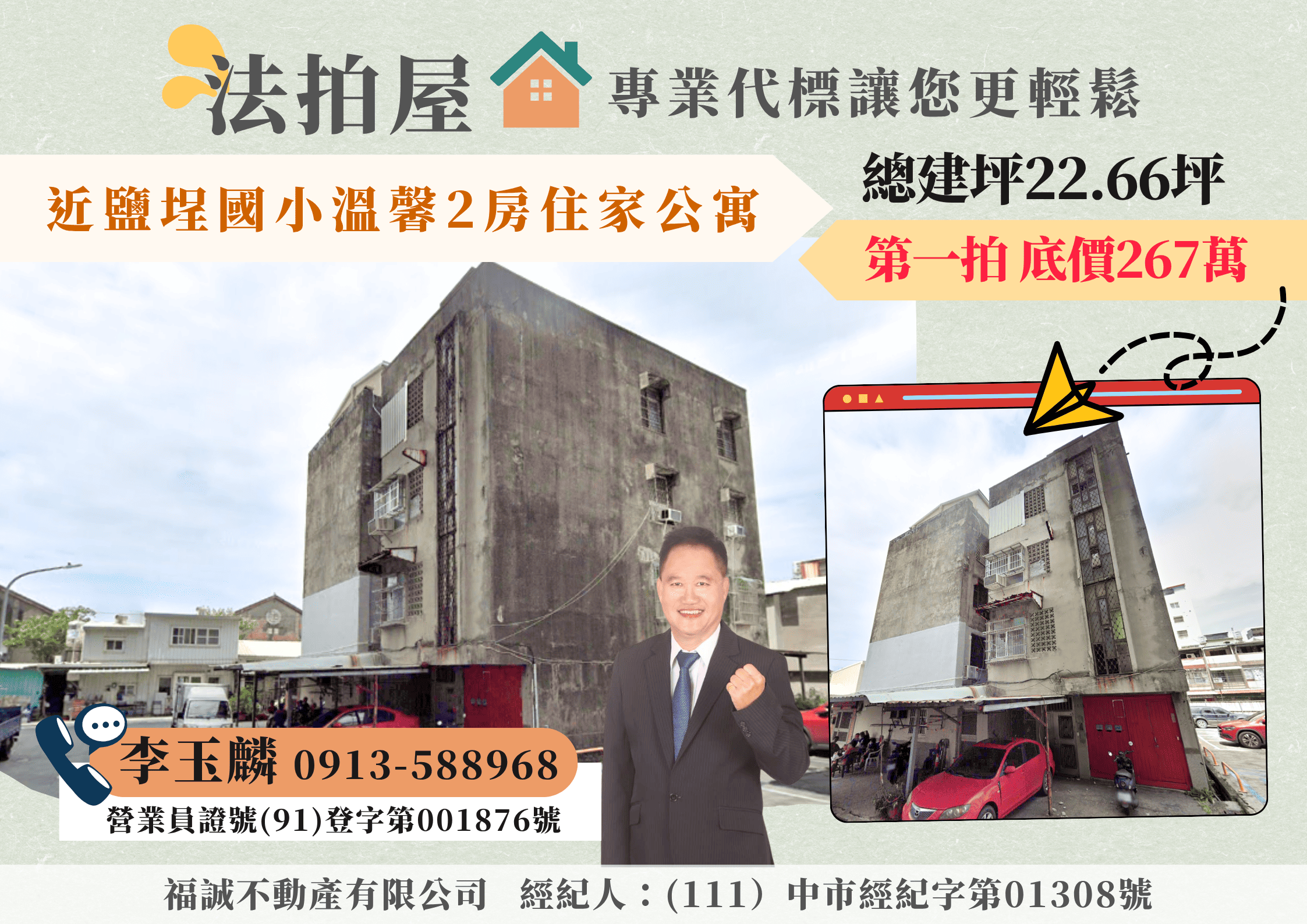 本人從事租屋、仲介、法拍已25年實戰經驗,經民國92年進入104法拍網,從事法拍屋標購、點交的工作至106年,106年繼續在福誠不動產服務大家,本人以不動產多年的經驗,秉持專業、務實、誠信的態度,從代標到點交,全程服務協助您《標的到又標的便宜》,並迅速取得交屋!! 讓《李玉麟 經理》來協助您!